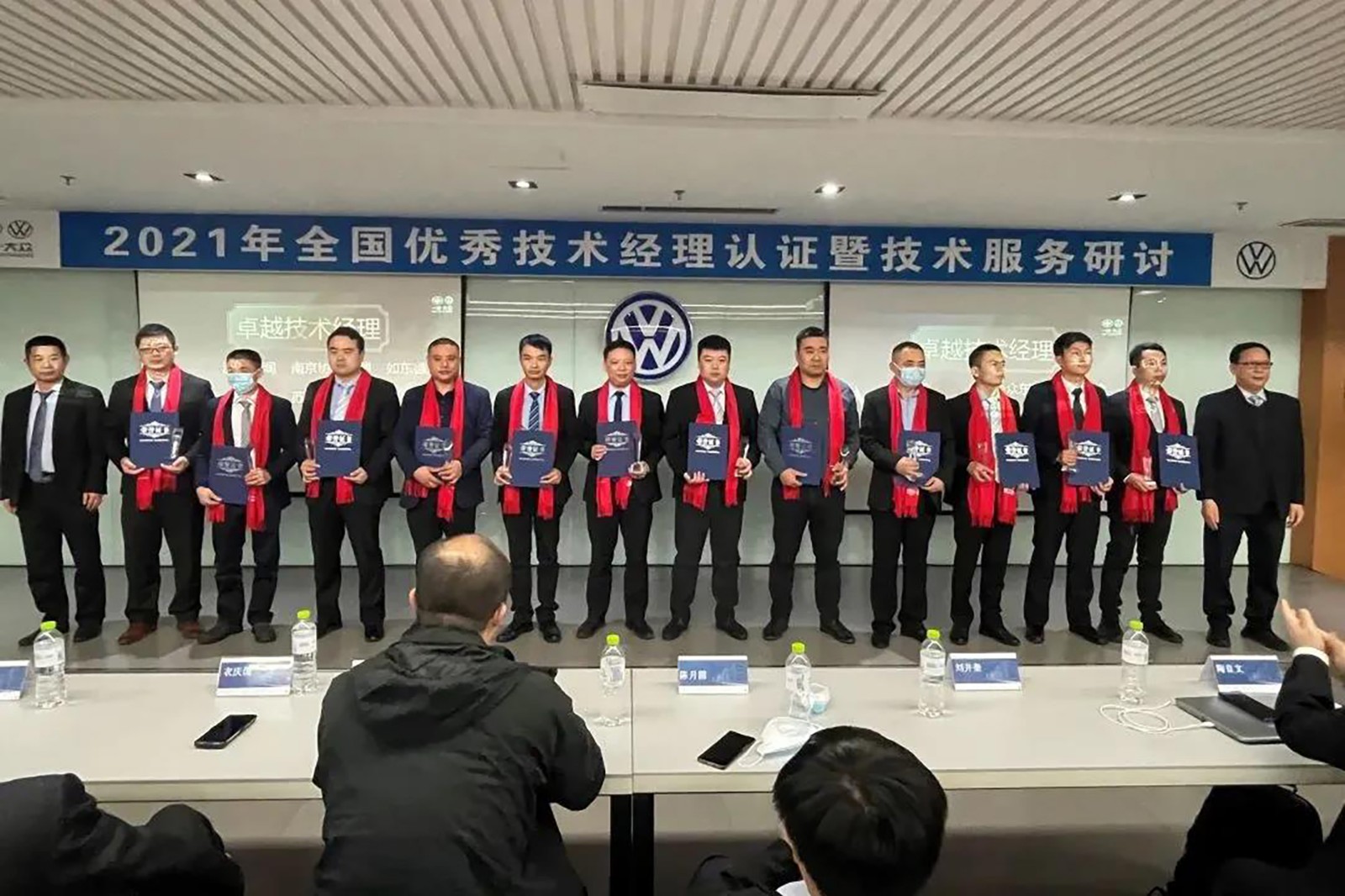 ? 2021年12月14日,一汽-大眾“全國優秀技術經理認證暨服務研 討會”在青島召開。華宏一汽-大眾服務總監彭圣榮榮獲一汽-大眾 “最佳維修質量管理獎”,技術經理劉平榮獲“全國卓越技術經理”。