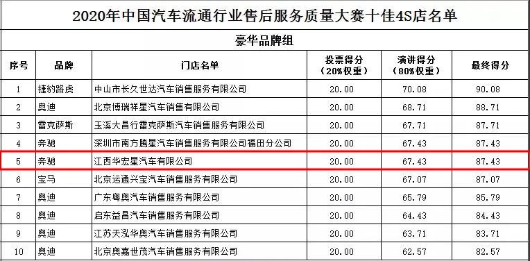 12月24日,“2020年中國汽車流通行業(yè)售后服務質(zhì)量大賽”決賽完美落幕。在為期三天的決賽中,共88家4S店進行了激烈的角逐,最終華宏奔馳望城旗艦店一馬當先,成功上榜“2020年中國汽車流通行業(yè)售后服務質(zhì)量十佳4S店”榜單。