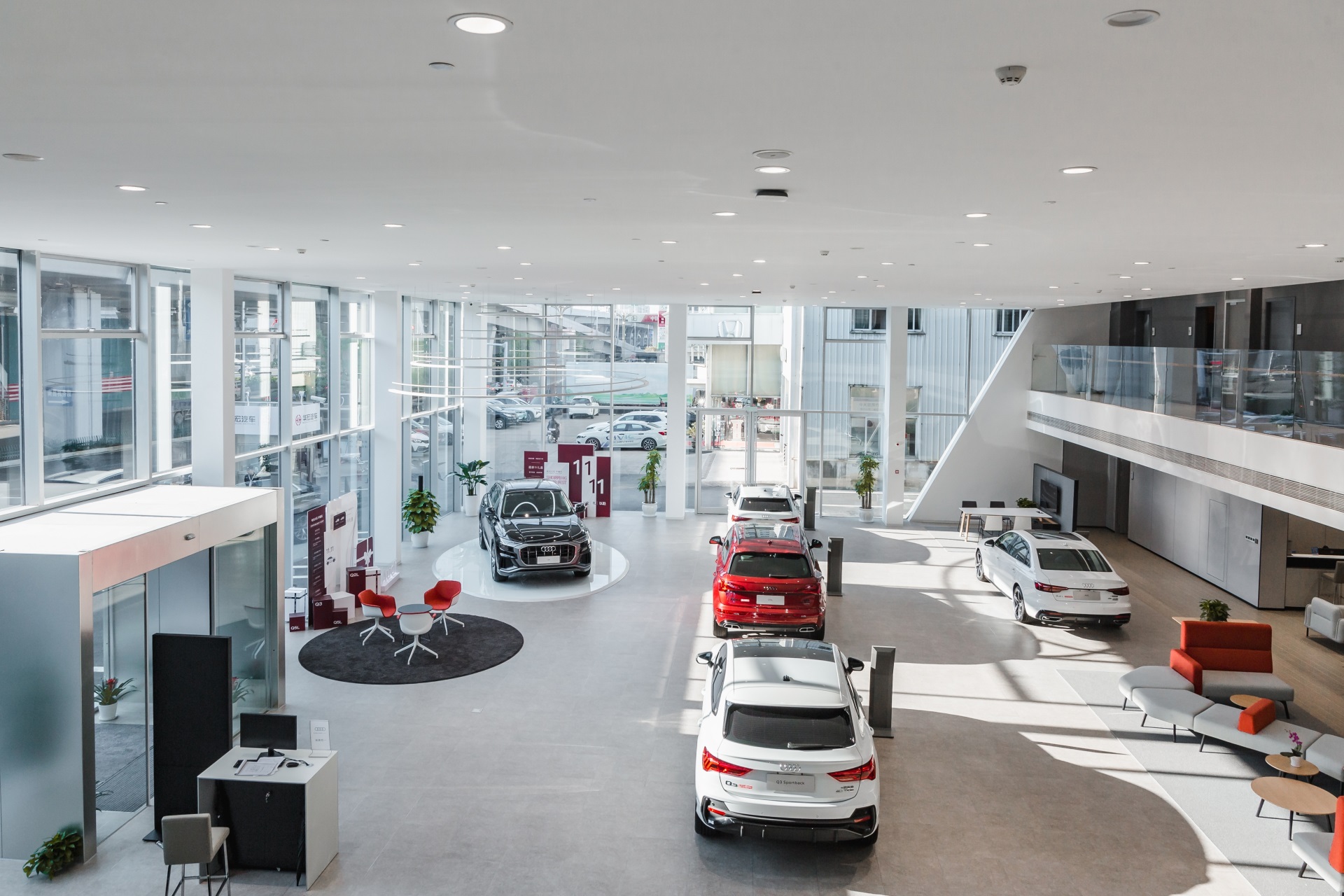 一汽奧迪的門店外觀極具品牌辨識度,充滿未來感的全鋁格柵外墻與大面積玻璃幕墻交相輝映,充滿設計感與科技感。寬敞明亮的展廳內,展車排列整齊、一塵不染,在柔和燈光的照映下熠熠生輝,彰顯豪華品質。