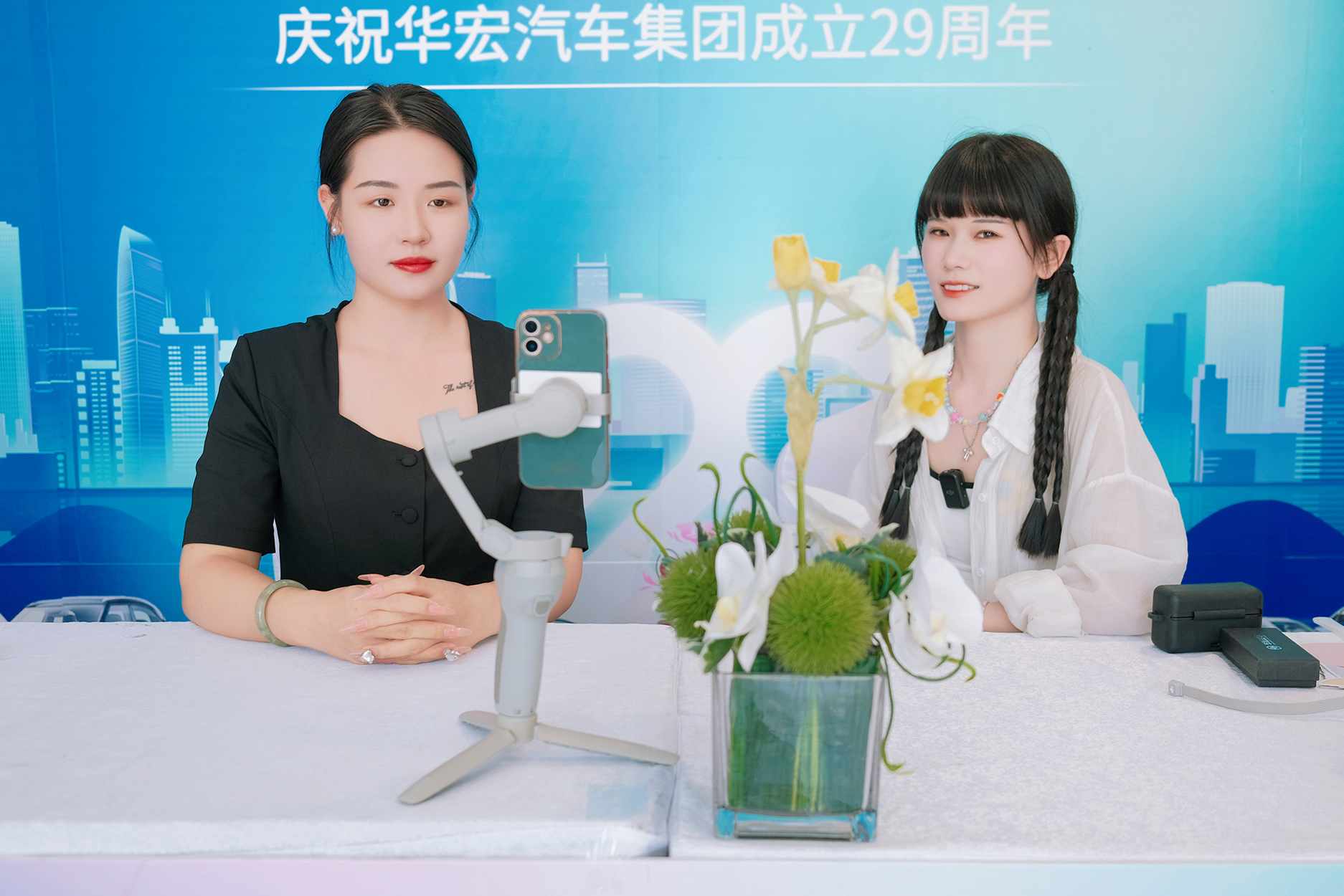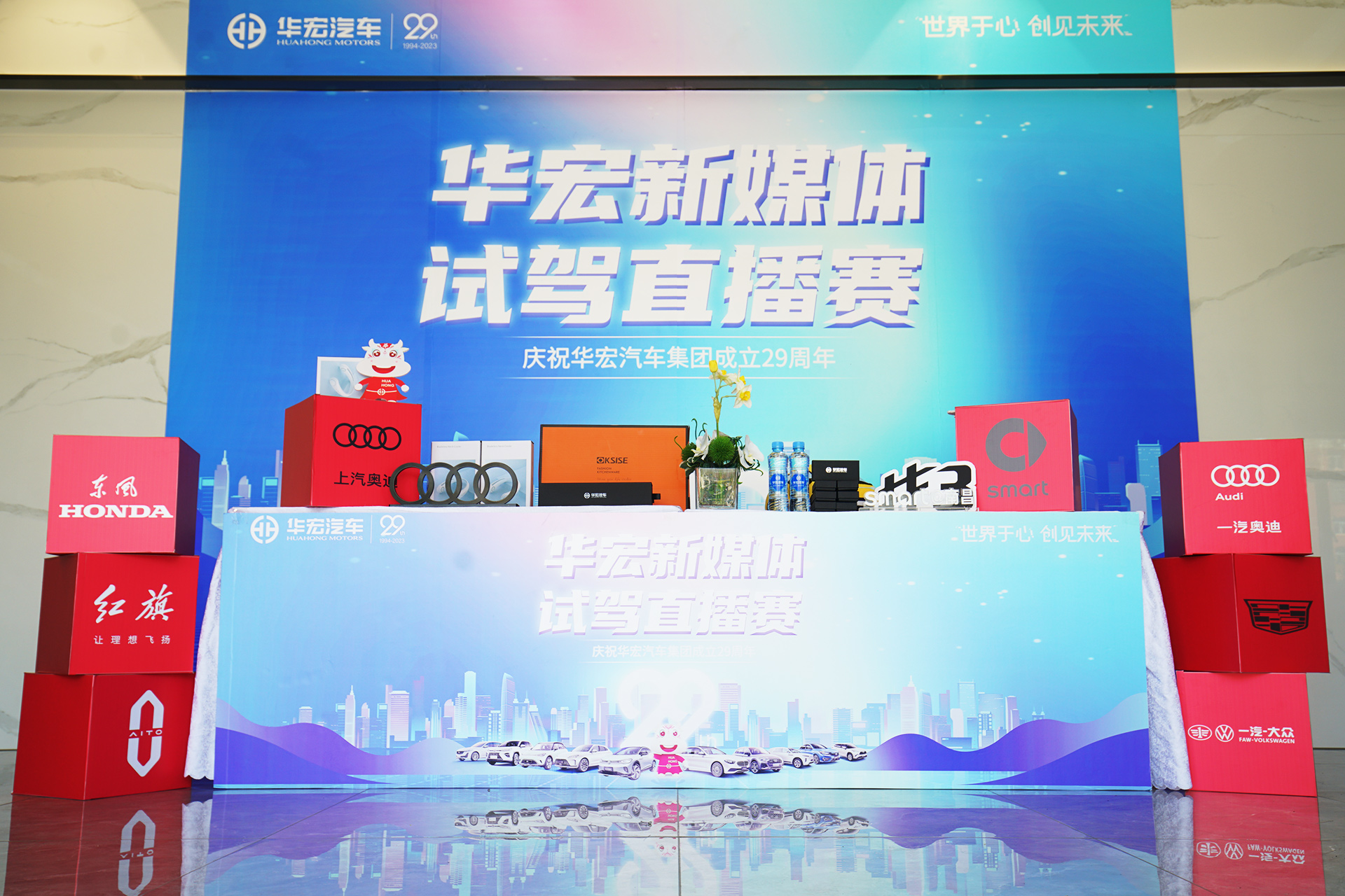 活動分為上午場和下午場,上午15位主播分別在新港汽車城各展廳進(jìn)行直播,八仙過海各顯神通,以各自的方式慶祝華宏29周年生日快樂,并為門店吸引關(guān)注和客流。