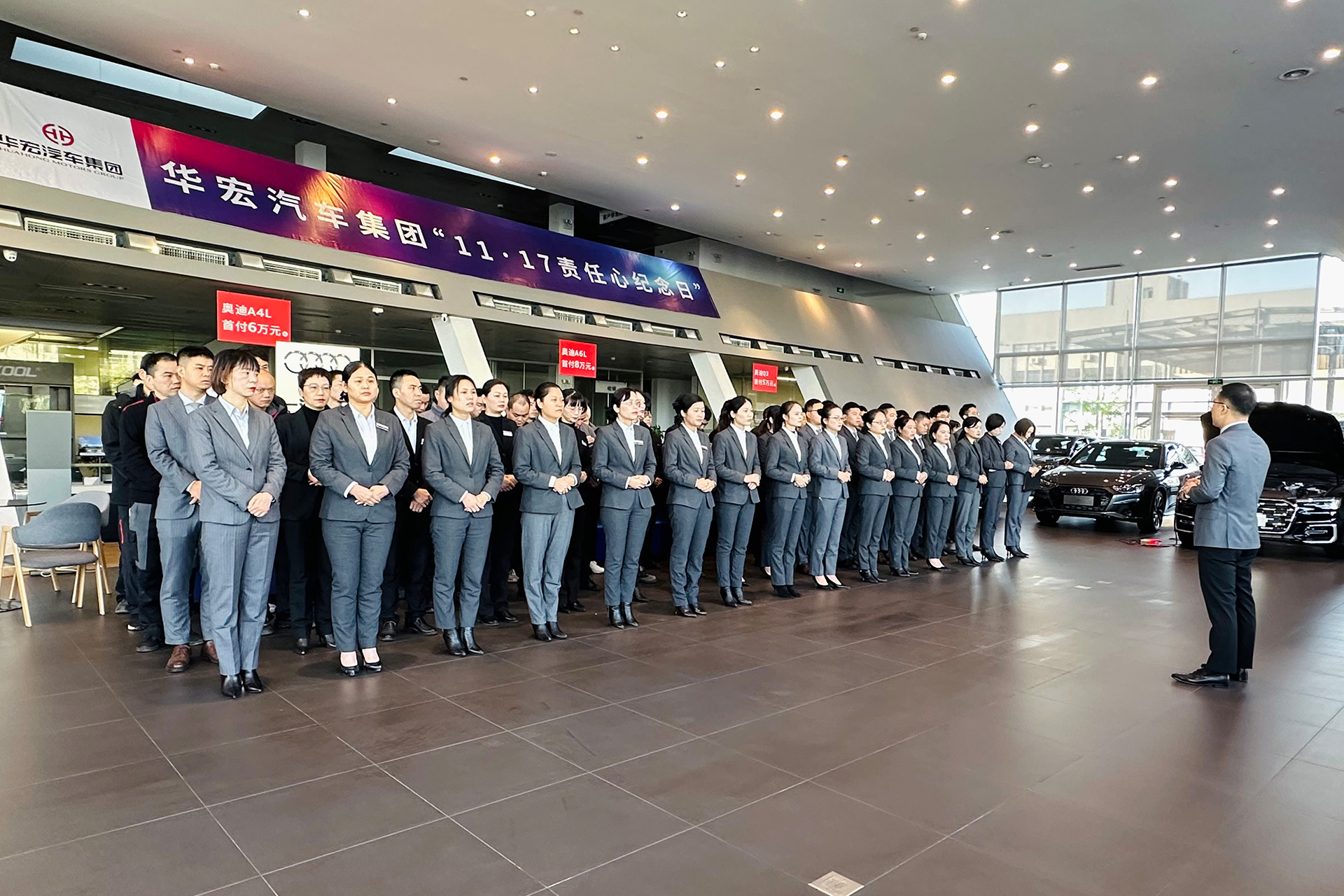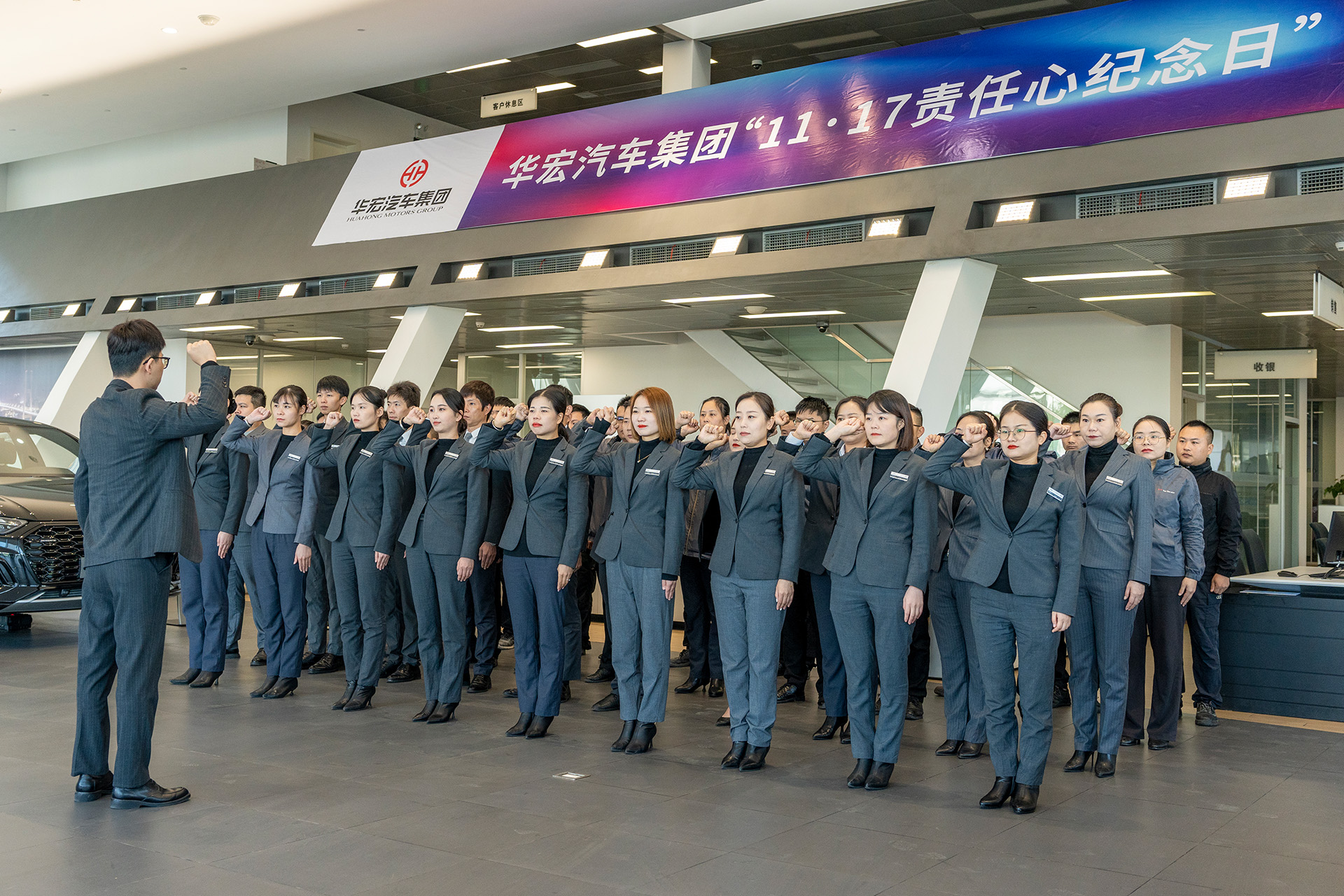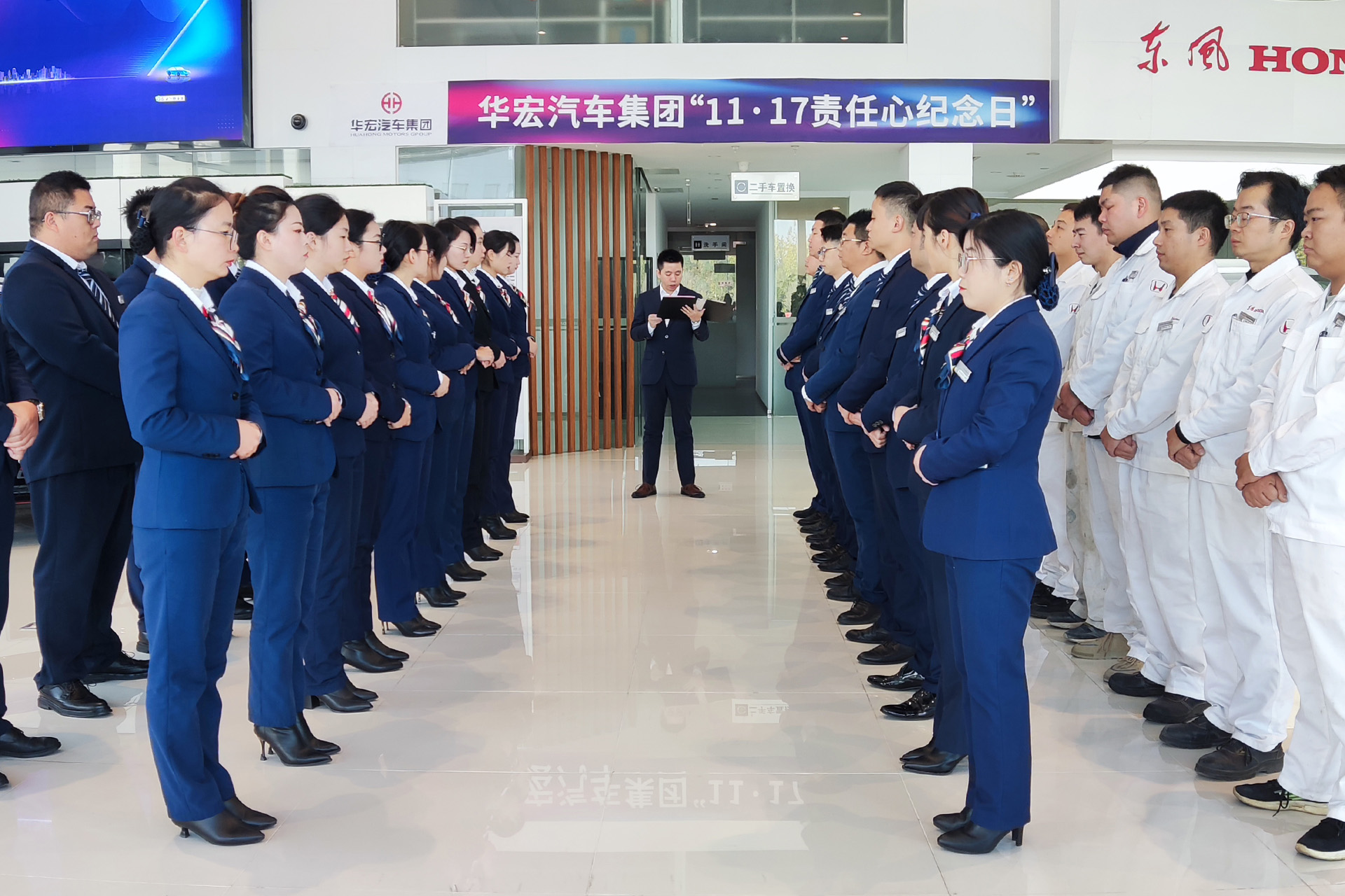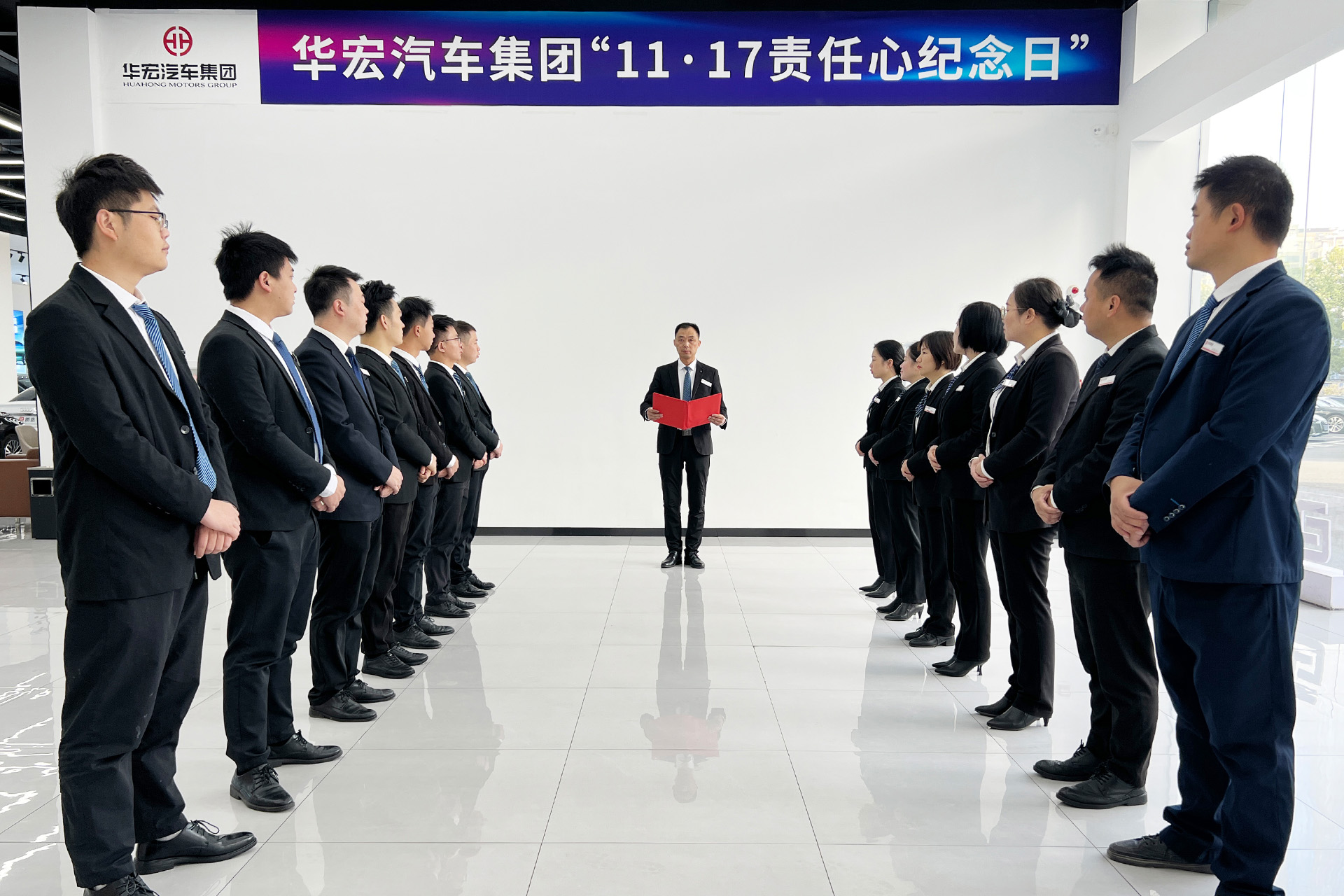 在各地晨會上,主持人首先宣讀了“11·17責任心紀念日”通稿。通稿回顧了紀念日的由來,并強調了華宏致力于打造成為中華民族優秀的百年服務品牌,我們的事業絕不是簡單的商業買賣,而是在踐行“為大眾提供高品質汽車文化生活”的企業使命。在打造百年華宏的道路上,每一位事業合作伙伴都應不斷強化自身品德意識和責任意識,并將其付諸行動。我們必須以戰戰兢兢、如履薄冰、時時放心不下的責任感,加強責任心教育,敢于追求、敢于挑戰、敢于變革,以胸中不滅之火焰,燃燒永遠不變之信念,為華宏的事業揮灑熱血。