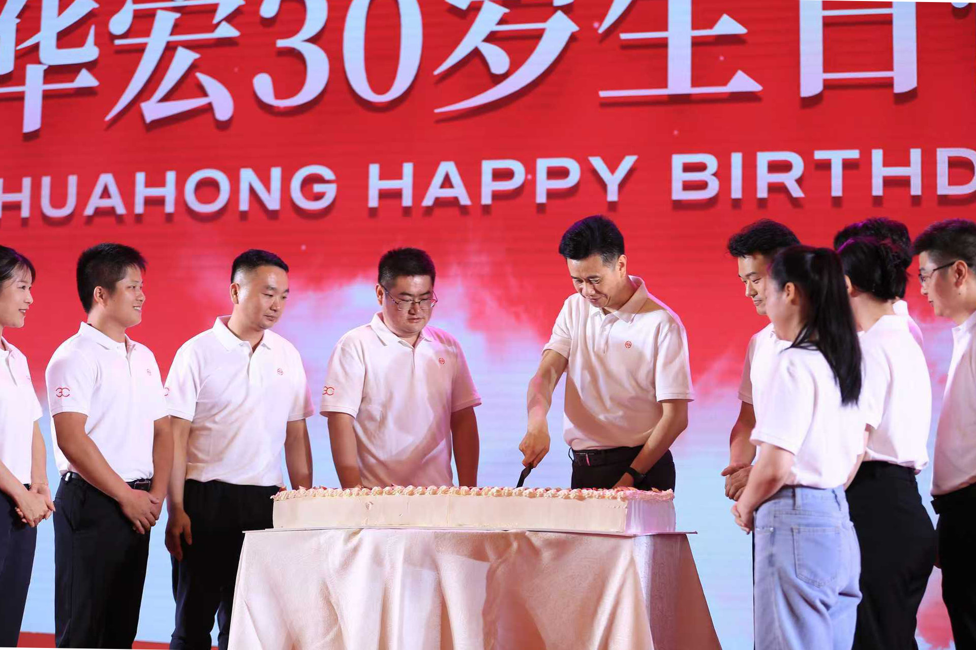 戴華和9位與華宏同天生日的員工,一起切下凝聚所有華宏人祝福的生日蛋糕,共同分享甜蜜與喜悅。全體高舉酒杯,共同祝福華宏30歲生日快樂!