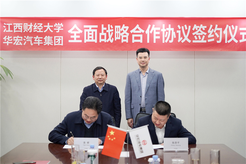 簽約儀式上,華宏汽車集團董事長戴華,江西財經大學黨委書記盧福財先后進行致辭。